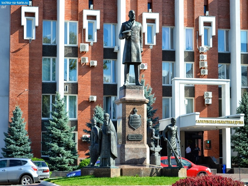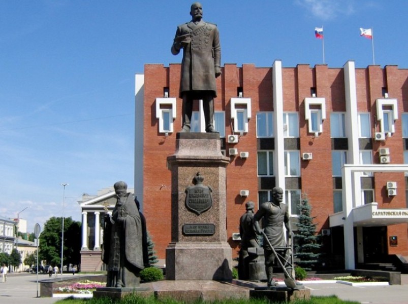 Памятная скульптура, посвященная государственному деятелю и саратовскому градоначальнику П. Столыпину была установлена в Саратове в 2002 году. Торжественную церемонию приурочили к юбилею со дня рождения великого российского реформатора. Памятник занимает почетное место перед зданием областной думы